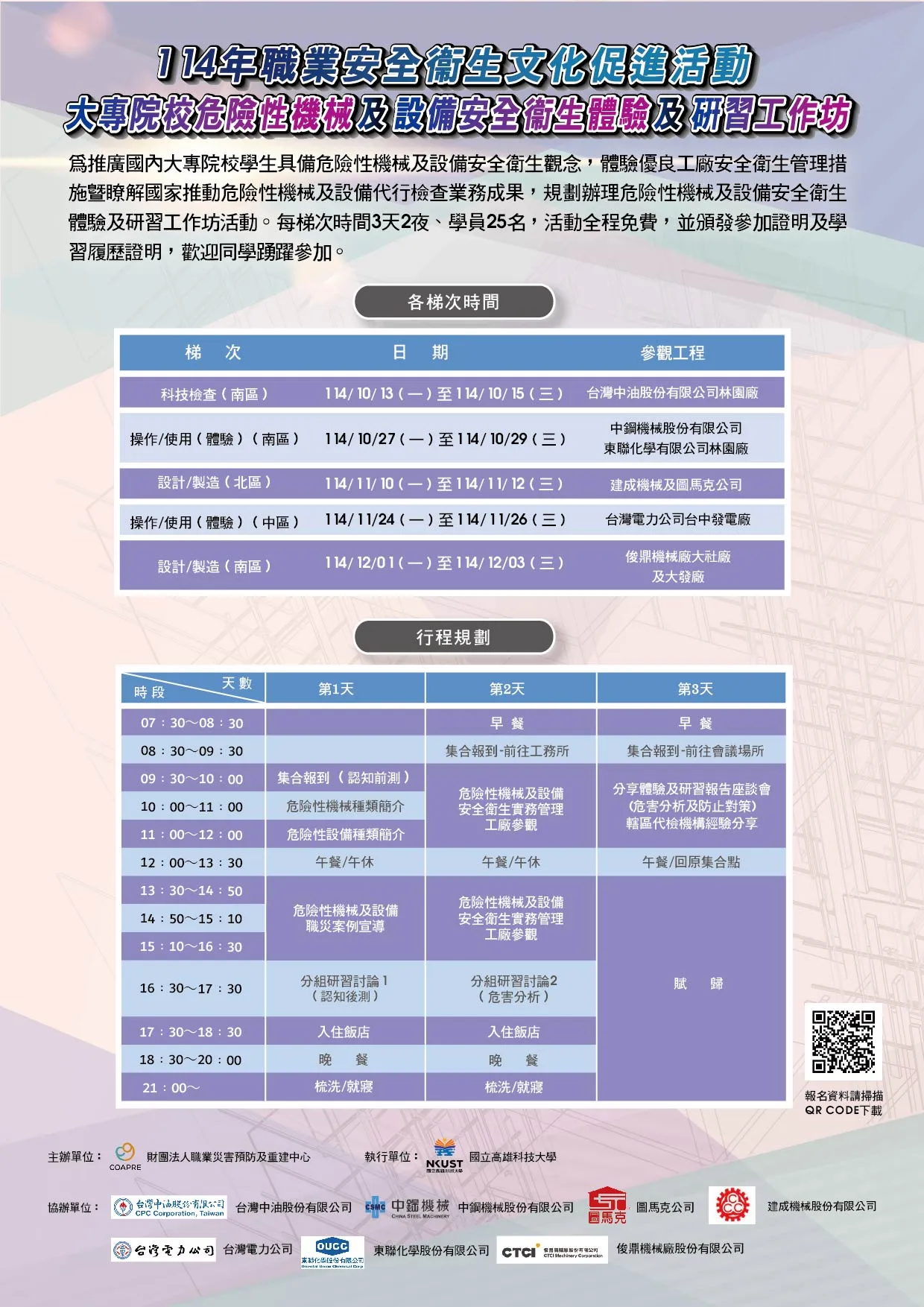 二、隨文檢附114年職業安全衛生文化促進活動-大專院校危險性機械及設備安全衛生體驗及研習工作坊之文宣資料及報名表紙本,電子檔下載網址http://www.ce.nkust.edu.tw/news_info.php?id=379。