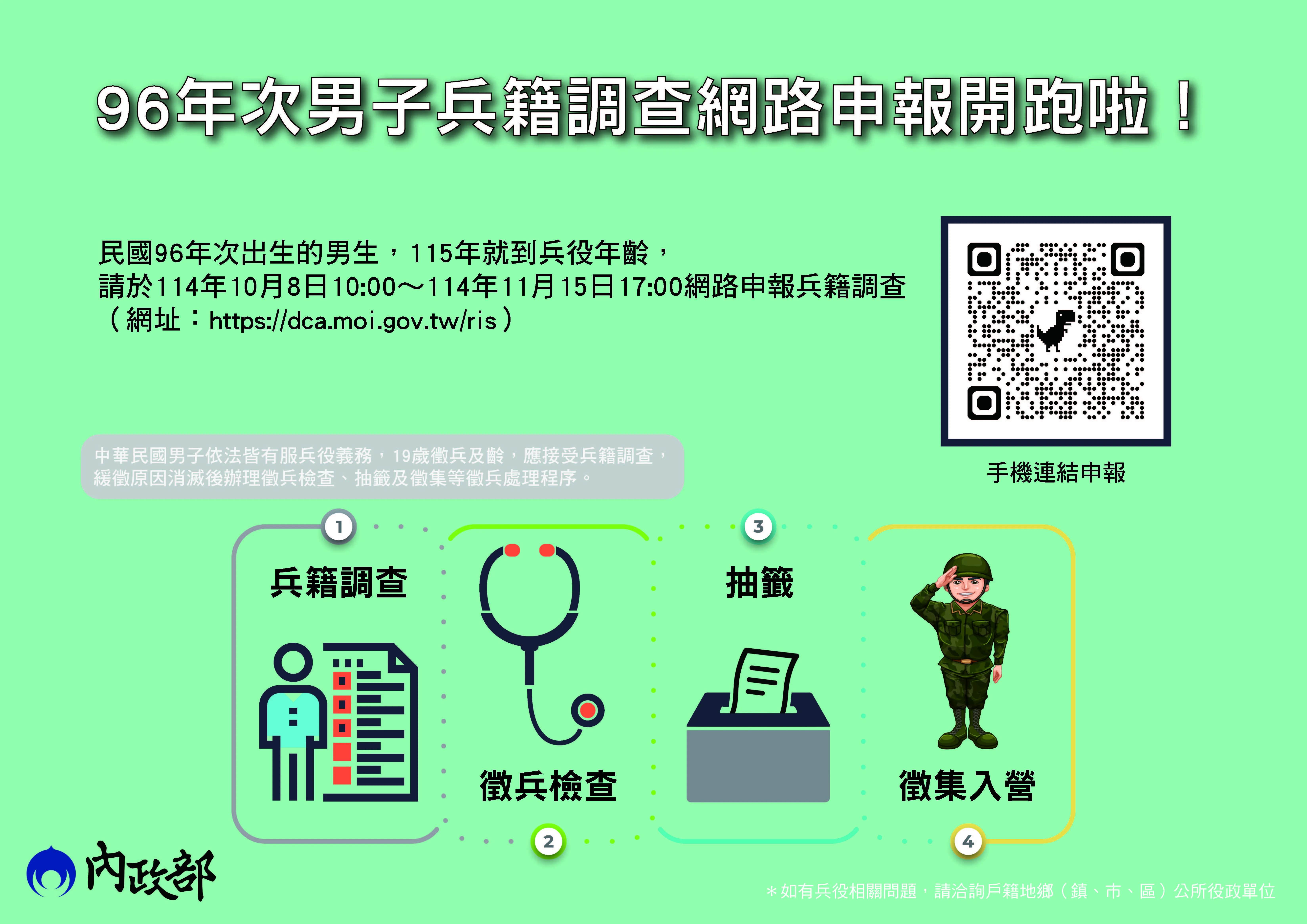 二、96年次男子明年屆徵兵及齡,於114年10月8日上午10時至11月15日下午5時,由內政部役政司網站首頁/主題單元/點選連結進入「兵籍調查線上申報」作業系統(網址:https://dca.moi.gov.tw/ris),登錄兵籍表所需之個人資料後即可完成兵籍調查作業。本校同學(役男)請多加利用電腦、手機、平板等裝置上網填報調查資料,如無升學意願者亦可儘早申報,以加速完成徵兵檢查及徵集入營事宜。