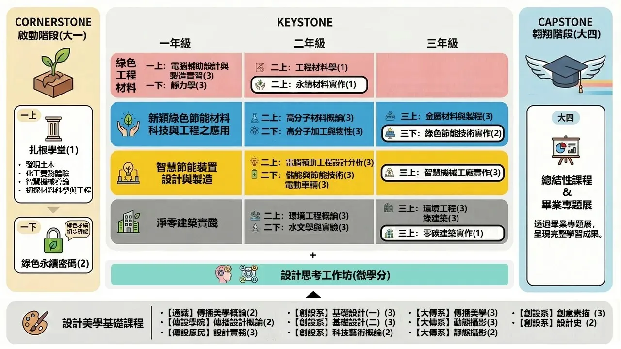 該學程打破科系限制,以院共同核心課程「綠色永續密碼」為基礎,並結合設計美學課程、設計思考工作坊與主題式課群,讓學生在理論與實務之間建立完整學習架構。主題式課群內容涵蓋綠色工程材料、新穎節能材料科技、智慧節能裝置設計以及淨零建築實踐等面向,學生透過工程分析、設計與軟體應用等方式完成實作專題,逐步培養跨域整合與創新思考能力。