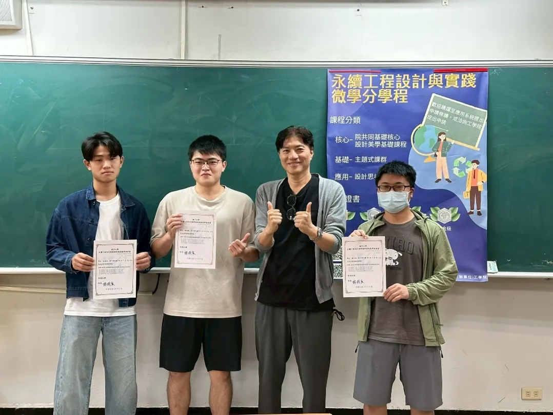在證書制度方面,本學程依學生完成的課程與工作坊時數進行分級。學生需先修習基礎課程,包括院共同核心課程「綠色永續密碼」,並至少修習一門設計美學基礎課程,建立永續與跨域設計的基本概念。接著再完成主題式課群課程,並參與設計思考工作坊。完成一個主題式課群並參與18小時工作坊者,可取得銅級證書;完成兩個主題式課群並累計36小時工作坊者,則可取得銀級證書。此次土木工程學系多位學生取得銅級與銀級證書,不僅展現學生在永續工程相關領域的學習成果,也反映出學生在跨域課程與實作學習上的投入。