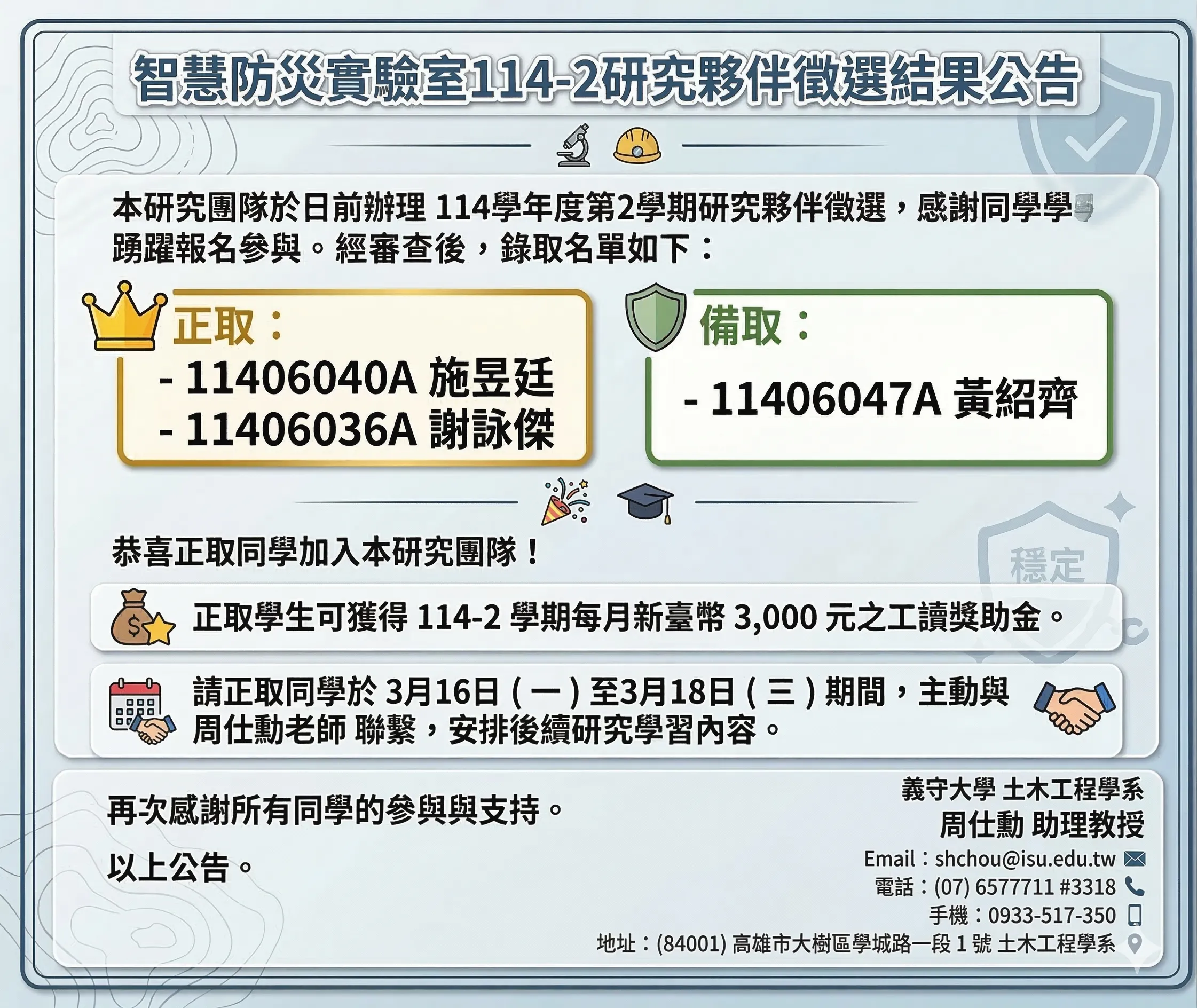本研究團隊於日前辦理 114學年度第2學期研究夥伴徵選,感謝同學踴躍報名參與。經審查後, 錄取名單如下: 正取: 11406040A 施昱廷 11406036A 謝詠傑 備取: 11406047A 黃紹齊 恭喜正取同學加入本研究團隊! 正取學生可獲得 每月新臺幣3,000元之工讀獎助金。 請正取同學於 3月16日(一)至3月18日(三)期間,主動與 周仕勳老師 聯繫,安排後續研究學習與工作內容。 再次感謝所有同學的參與與支持。 以上公告。 |